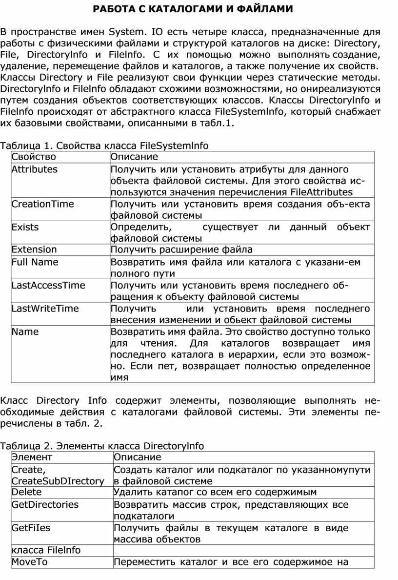 Классы Directory и File реализуют свои функции через статические методы. Directorylnfo и Filelnfo обладают схожими возможностями, но они реализуются путем создания объектов соответствующих классов. Классы Directorylnfo и Filelnfo происходят от абстрактного класса FileSystemlnfo, который снабжает их базовыми свойствами, описанными в табл.1.
