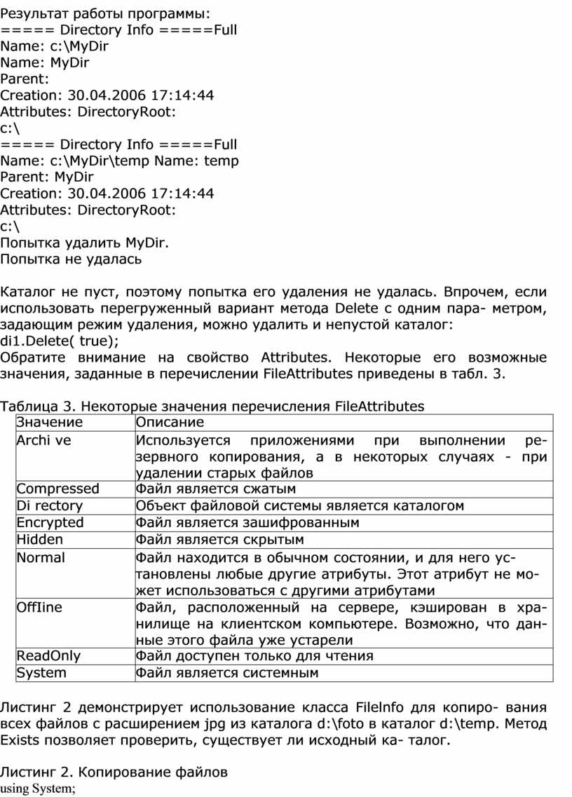 Обратите внимание на свойство Attributes. Некоторые его возможные значения, заданные в перечислении FileAttributes приведены в табл. 3.