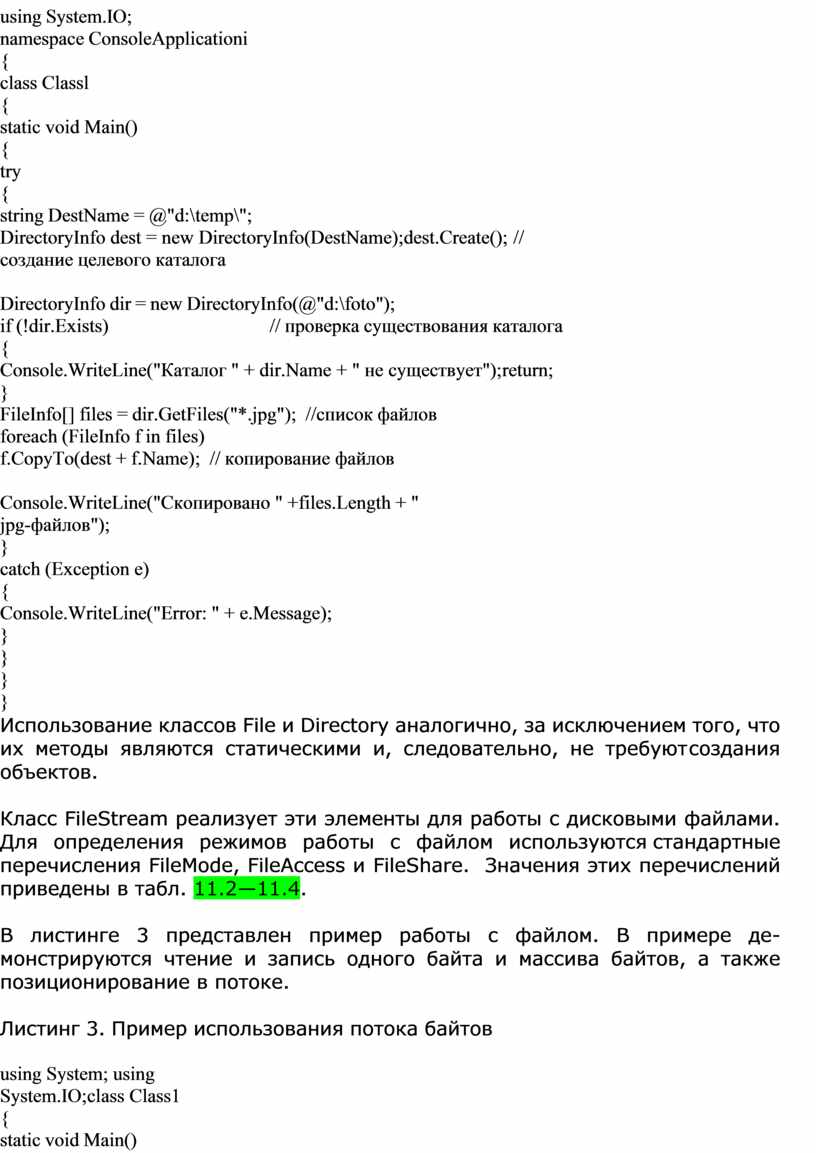 Листинг 2 демонстрирует использование класса Filelnfo для копиро- вания всех файлов с расширением jpg из каталога d:\foto в каталог d:\temp. Метод Exists позволяет проверить, существует ли исходный ка- талог.