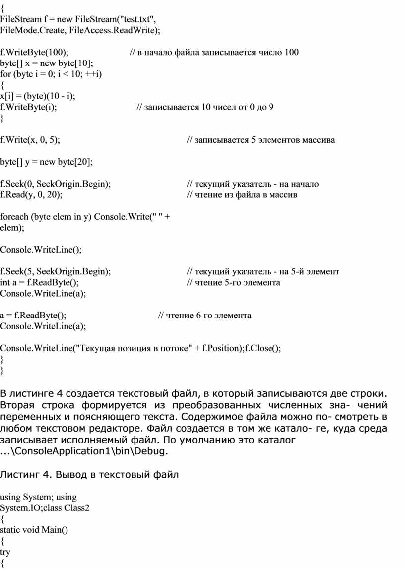 В листинге 3 представлен пример работы с файлом. В примере де- монстрируются чтение и запись одного байта и массива байтов, а также позиционирование в потоке.