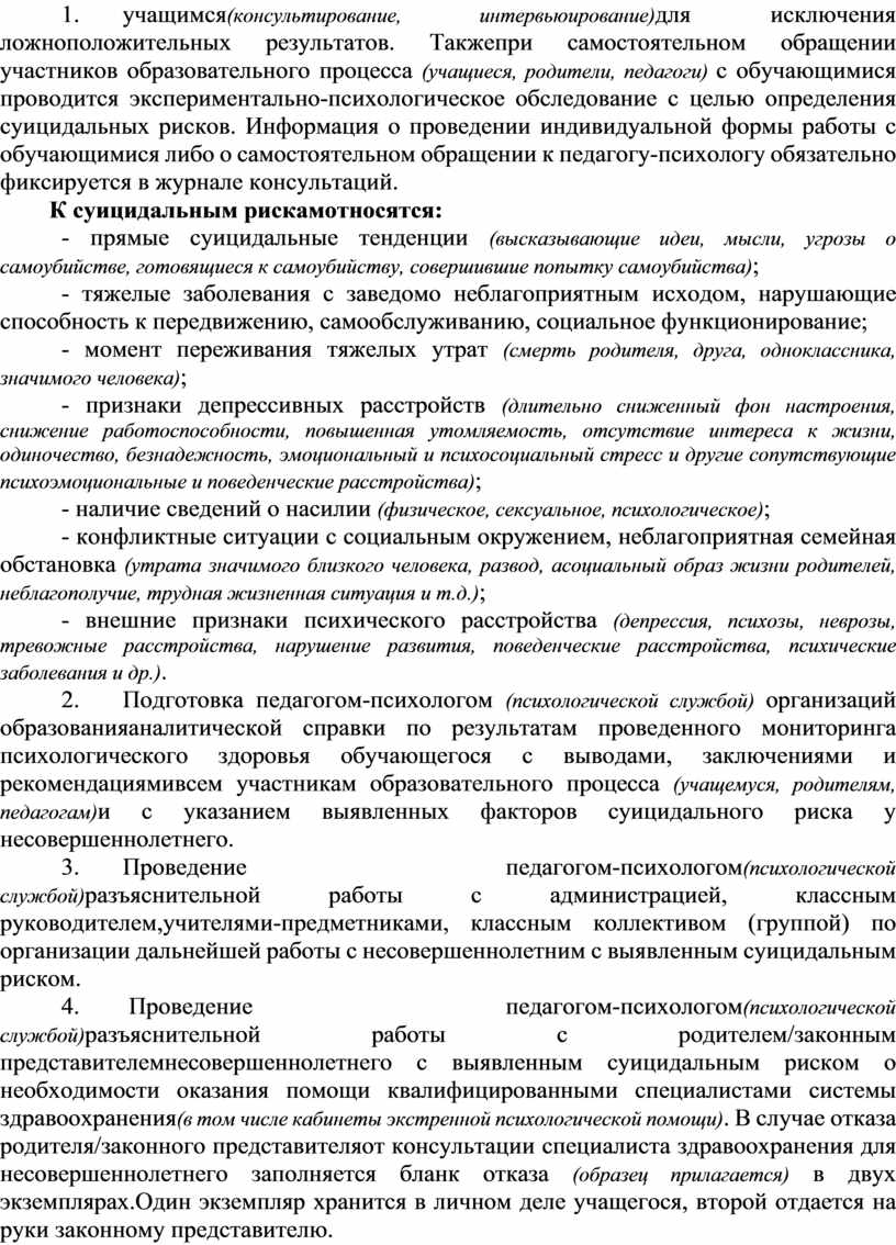 2. При выявлении по результатам диагностических исследований обучающихся с признаками аутодеструктивного поведения либо кризисного состоянияпедагогом-психологом (психологической службой) организации образованиянеобходимо провести индивидуальную работу с данным учащимся(консультирование, интервьюирование)для исключения ложноположительных результатов. Такжепри самостоятельном обращении участников образовательного процесса (учащиеся, родители, педагоги) с обучающимися проводится экспериментально-психологическое обследование с целью определения суицидальных рисков. Информация о проведении индивидуальной формы работы с обучающимися либо о самостоятельном обращении к педагогу-психологу обязательно фиксируется в журнале консультаций.