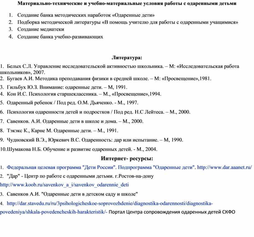 Материально-технические и учебно-материальные условия работы с одаренными детьми