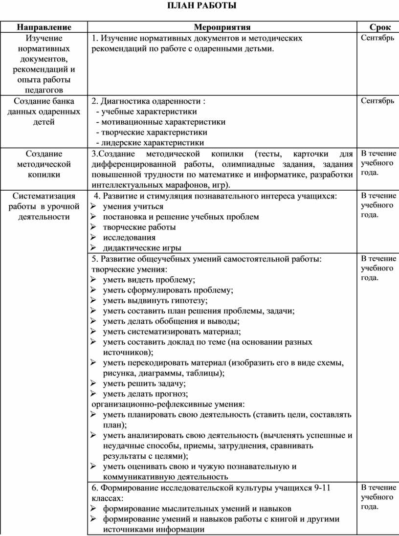 1. Изучение нормативных документов и методических рекомендаций по работе с одаренными детьми. |