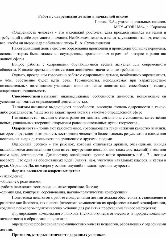 Если дети – это достояние нашей страны, то одаренные дети - это её интеллектуальный потенциал. Насколько раньше учитель обнаружит незаурядные способности в своих учебниках и сумеет создать для них условия для обучения, тем больше надежд на то, что в будущем эти дети составят гордость и славу своего отечества.