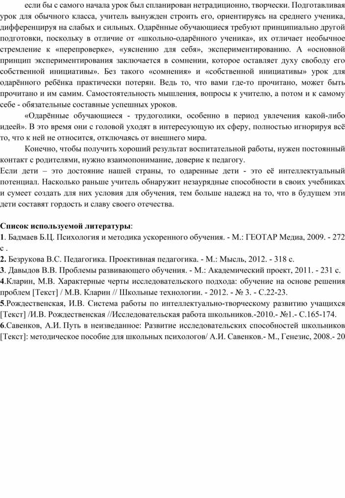 5.Рождественская, И.В. Система работы по интеллектуально-творческому развитию учащихся [Текст] /И.В. Рождественская //Исследовательская работа школьников.-2010.- №1.- С.165-174.