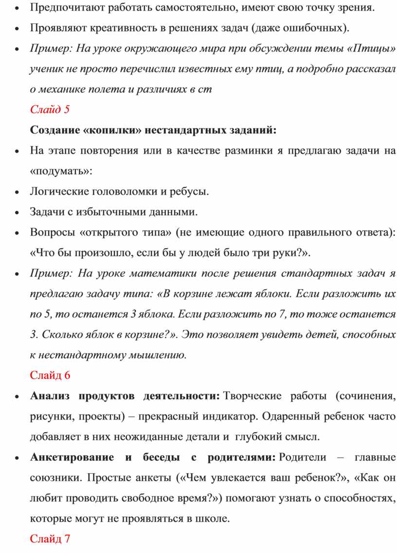 · Пример: На уроке математики после решения стандартных задач я предлагаю задачу типа: «В корзине лежат яблоки. Если разложить их по 5, то останется 3 яблока. Если разложить по 7, то тоже останется 3. Сколько яблок в корзине?». Это позволяет увидеть детей, способных к нестандартному мышлению.