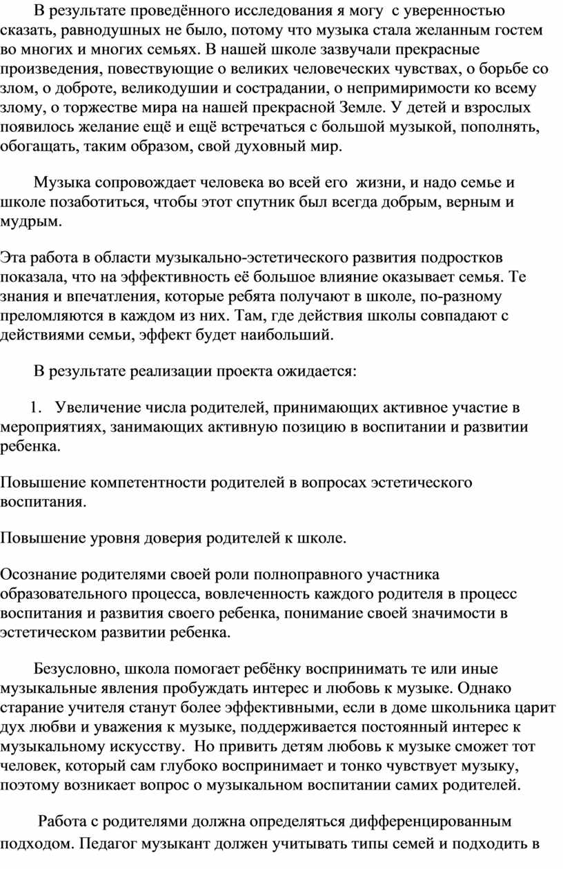 Эта работа в области музыкально-эстетического развития подростков показала, что на эффективность её большое влияние оказывает семья. Те знания и впечатления, которые ребята получают в школе, по-разному преломляются в каждом из них. Там, где действия школы совпадают с действиями семьи, эффект будет наибольший.