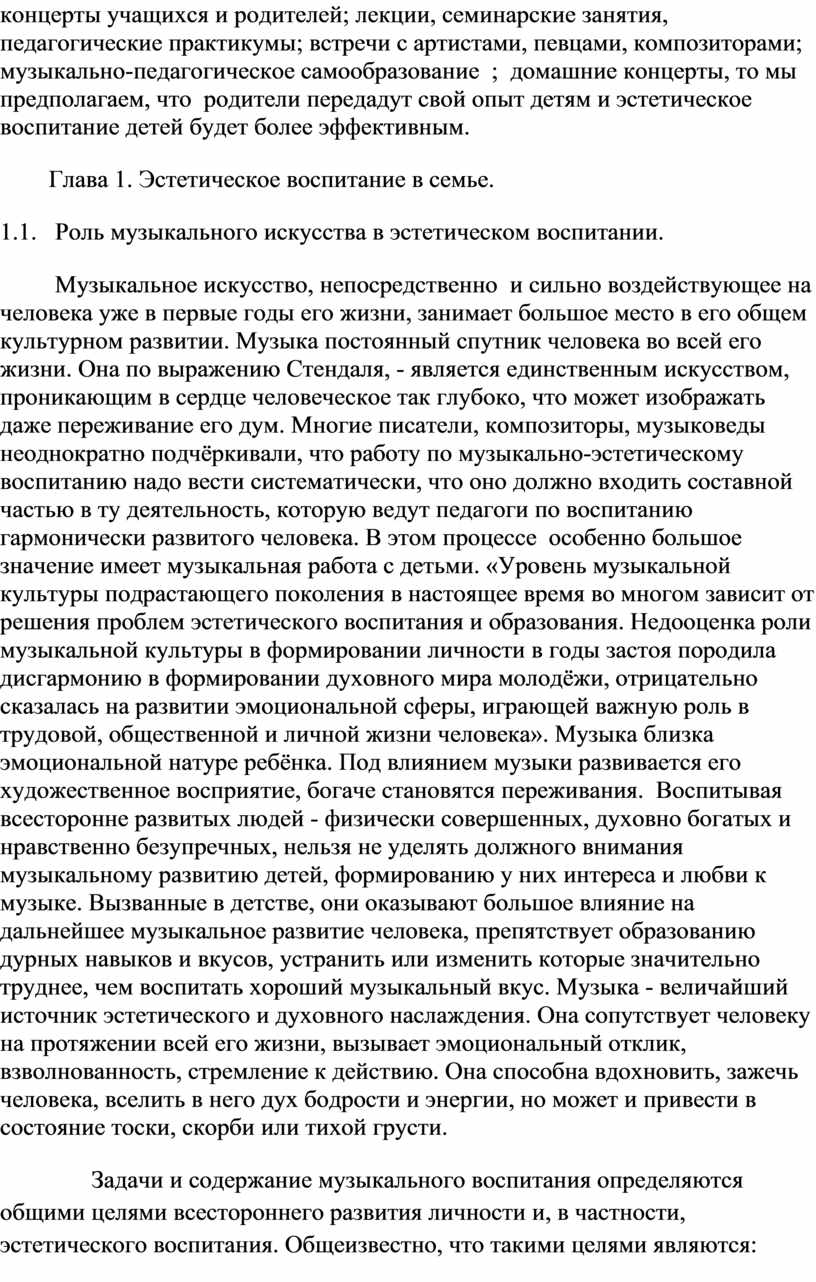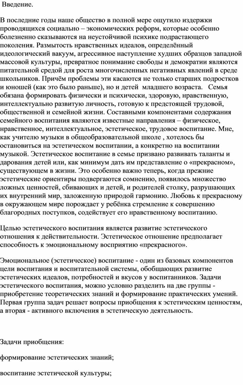 В последние годы наше общество в полной мере ощутило издержки проводящихся социально – экономических реформ, которые особенно болезненно сказываются на неустойчивой психике подрастающего поколения. Размытость нравственных идеалов, определённый идеологический вакуум, агрессивное наступление худших образцов западной массовой культуры, превратное понимание свободы и демократии являются питательной средой для роста многочисленных негативных явлений в среде школьников. Причём проблемы эти касаются не только старших подростков и юношей (как это было раньше), но и детей младшего возраста. Семья обязана формировать физически и психически, здоровую, нравственную, интеллектуально развитую личность, готовую к предстоящей трудовой, общественной и семейной жизни. Составными компонентами содержания семейного воспитания являются известные направления – физическое, нравственное, интеллектуальное, эстетическое, трудовое воспитание. Мне, как учителю музыки в общеобразовательной школе , хотелось бы остановиться на эстетическом воспитании, а конкретно на воспитании музыкой. Эстетическое воспитание в семье призвано развивать таланты и дарования детей или, как минимум дать им представление о «прекрасном», существующем в жизни. Это особенно важно теперь, когда прежние эстетические ориентиры подвергаются сомнению, появилось множество ложных ценностей, сбивающих и детей, и родителей столку, разрушающих их внутренний мир, заложенную природой гармонию. Любовь к прекрасному в окружающем мире порождает у ребёнка стремление к совершению благородных поступков, содействует его нравственному воспитанию.