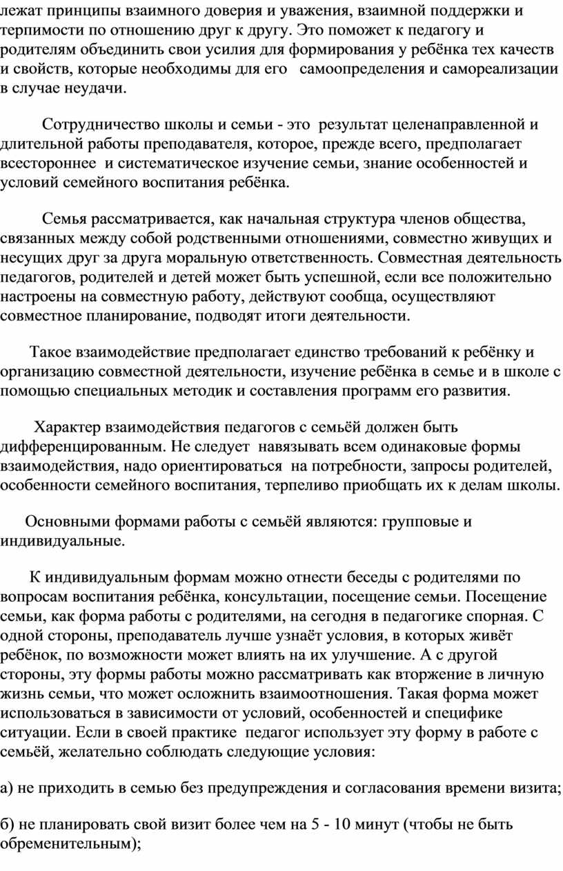 Суть взаимодействия преподавателя и семьи заключается в том, что обе стороны должны быть заинтересованы в изучении ребёнка, раскрытии и развитии в нём лучших качеств и свойств. В основе такого взаимодействия лежат принципы взаимного доверия и уважения, взаимной поддержки и терпимости по отношению друг к другу. Это поможет к педагогу и родителям объединить свои усилия для формирования у ребёнка тех качеств и свойств, которые необходимы для его самоопределения и самореализации в случае неудачи.