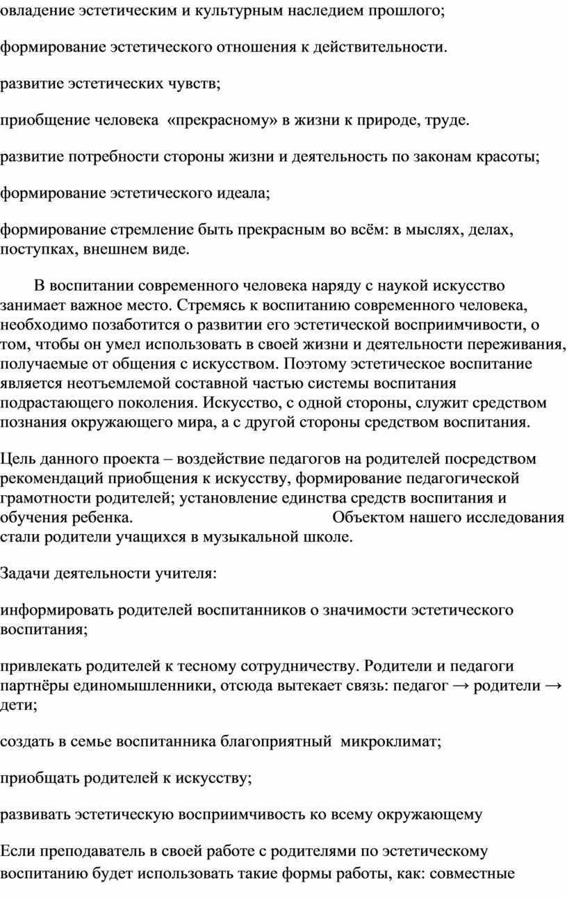 Цель данного проекта – воздействие педагогов на родителей посредством рекомендаций приобщения к искусству, формирование педагогической грамотности родителей; установление единства средств воспитания и обучения ребенка. Объектом нашего исследования стали родители учащихся в музыкальной школе.
