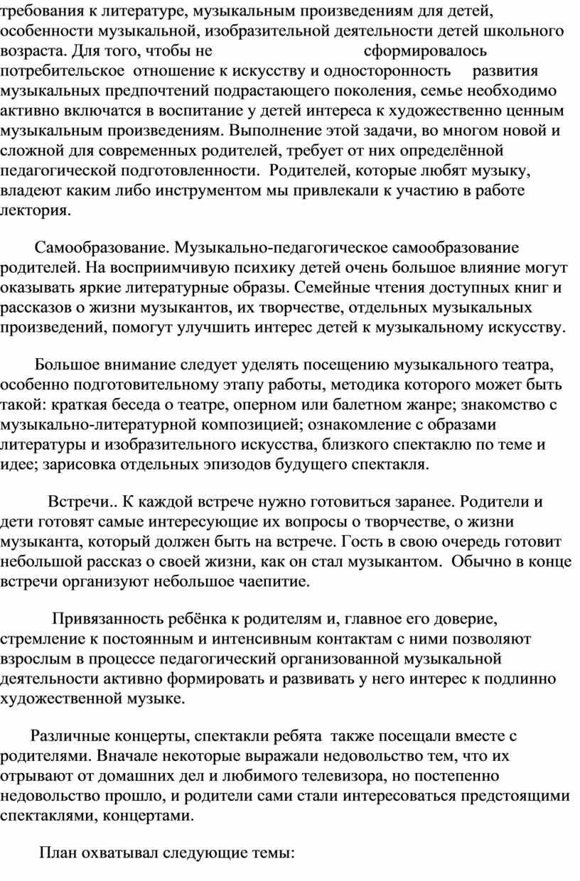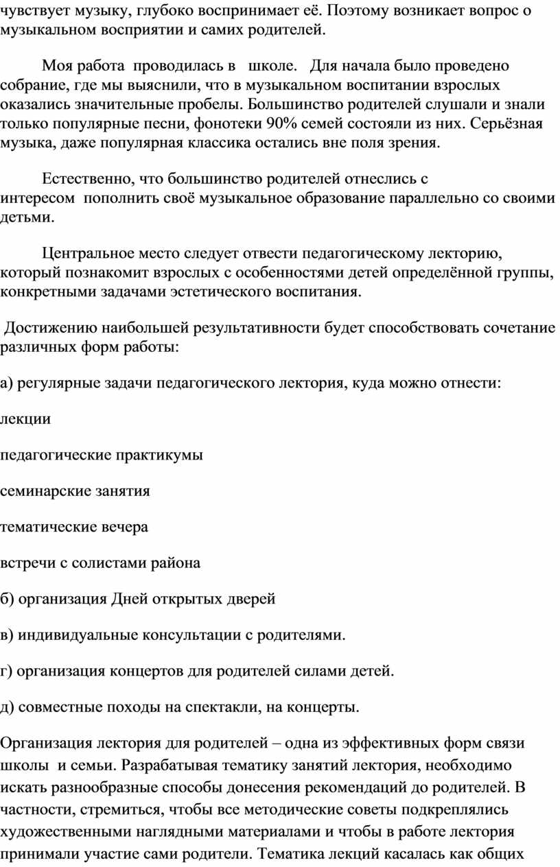 Организация лектория для родителей – одна из эффективных форм связи школы и семьи. Разрабатывая тематику занятий лектория, необходимо искать разнообразные способы донесения рекомендаций до родителей. В частности, стремиться, чтобы все методические советы подкреплялись художественными наглядными материалами и чтобы в работе лектория принимали участие сами родители. Тематика лекций касалась как общих задач эстетического воспитания, так и более частных, например: рекомендации по эстетике одежды, художественно-педагогические требования к литературе, музыкальным произведениям для детей, особенности музыкальной, изобразительной деятельности детей школьного возраста. Для того, чтобы не сформировалось потребительское отношение к искусству и односторонность развития музыкальных предпочтений подрастающего поколения, семье необходимо активно включатся в воспитание у детей интереса к художественно ценным музыкальным произведениям. Выполнение этой задачи, во многом новой и сложной для современных родителей, требует от них определённой педагогической подготовленности. Родителей, которые любят музыку, владеют каким либо инструментом мы привлекали к участию в работе лектория.