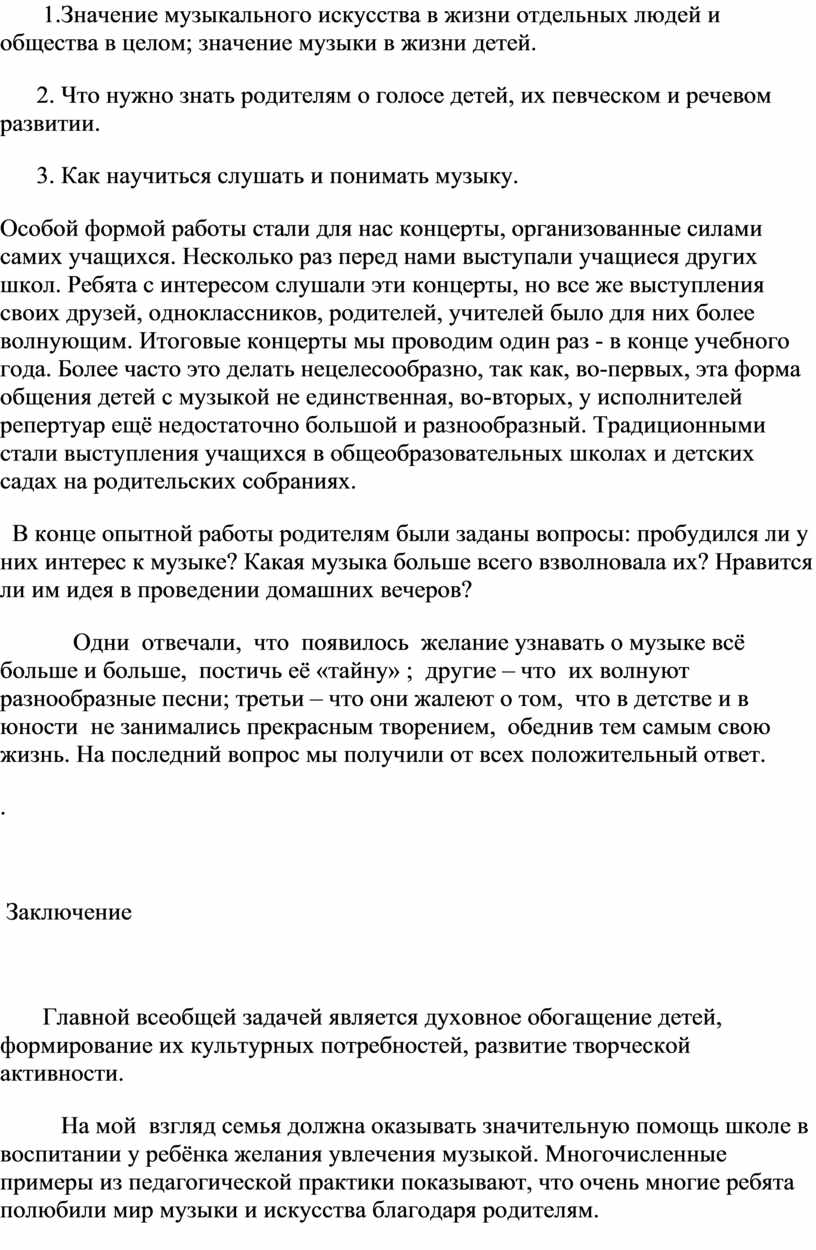 1.Значение музыкального искусства в жизни отдельных людей и общества в целом; значение музыки в жизни детей.