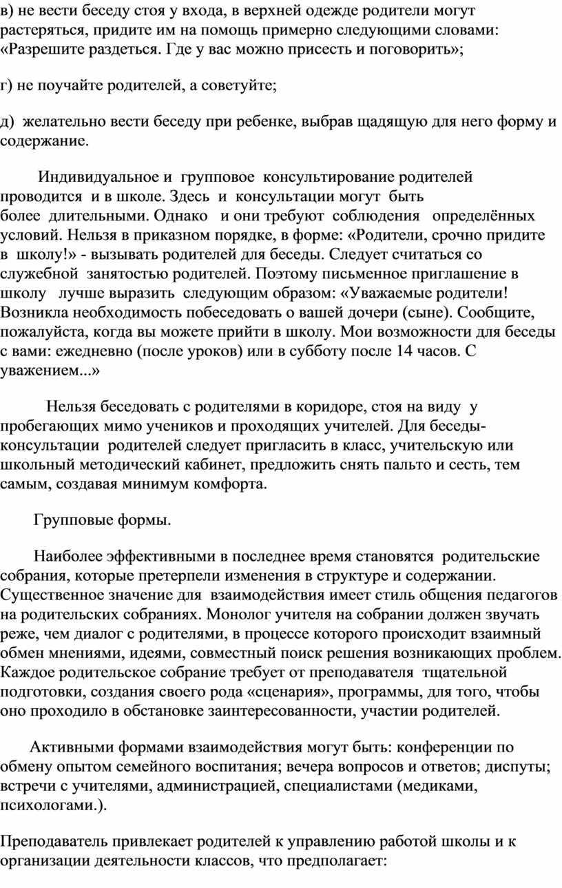 Индивидуальное и групповое консультирование родителей проводится и в школе. Здесь и консультации могут быть более длительными. Однако и они требуют соблюдения определённых условий. Нельзя в приказном порядке, в форме: «Родители, срочно придите в школу!» - вызывать родителей для беседы. Следует считаться со служебной занятостью родителей. Поэтому письменное приглашение в школу лучше выразить следующим образом: «Уважаемые родители! Возникла необходимость побеседовать о вашей дочери (сыне). Сообщите, пожалуйста, когда вы можете прийти в школу. Мои возможности для беседы с вами: ежедневно (после уроков) или в субботу после 14 часов. С уважением...»
