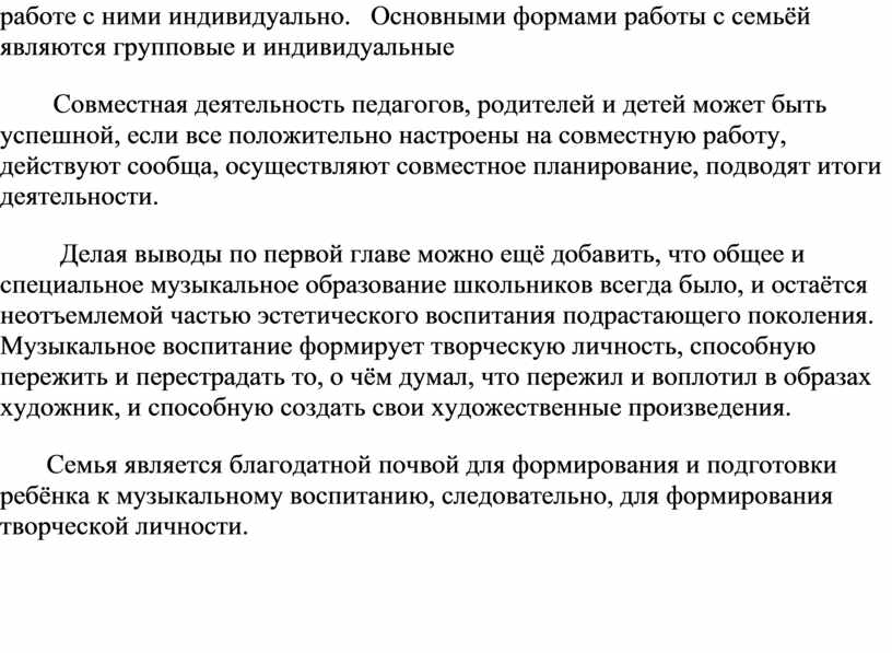 Делая выводы по первой главе можно ещё добавить, что общее и специальное музыкальное образование школьников всегда было, и остаётся неотъемлемой частью эстетического воспитания подрастающего поколения. Музыкальное воспитание формирует творческую личность, способную пережить и перестрадать то, о чём думал, что пережил и воплотил в образах художник, и способную создать свои художественные произведения.