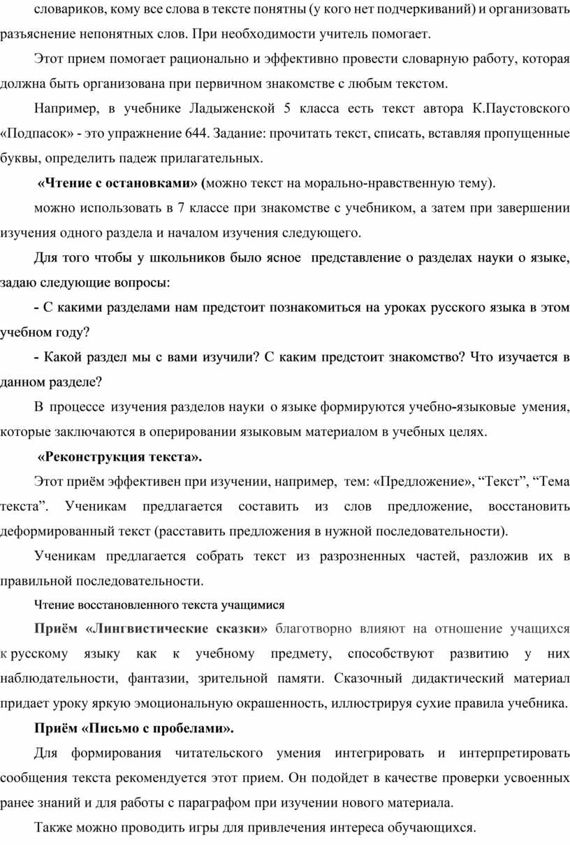 Работа с текстом как один из способов формирования читательской грамотности на уроках русского языка в среднем звене
