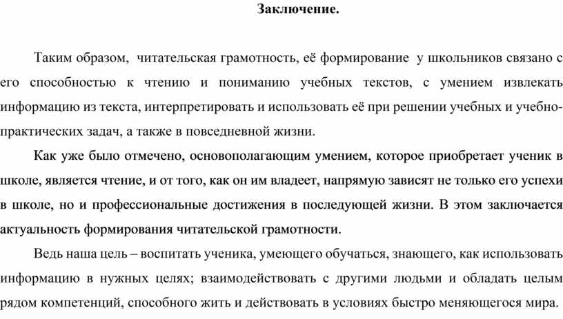 Таким образом, читательская грамотность, её формирование у школьников связано с его способностью к чтению и пониманию учебных текстов, с умением извлекать информацию из текста, интерпретировать и использовать её при решении учебных и учебно-практических задач, а также в повседневной жизни.