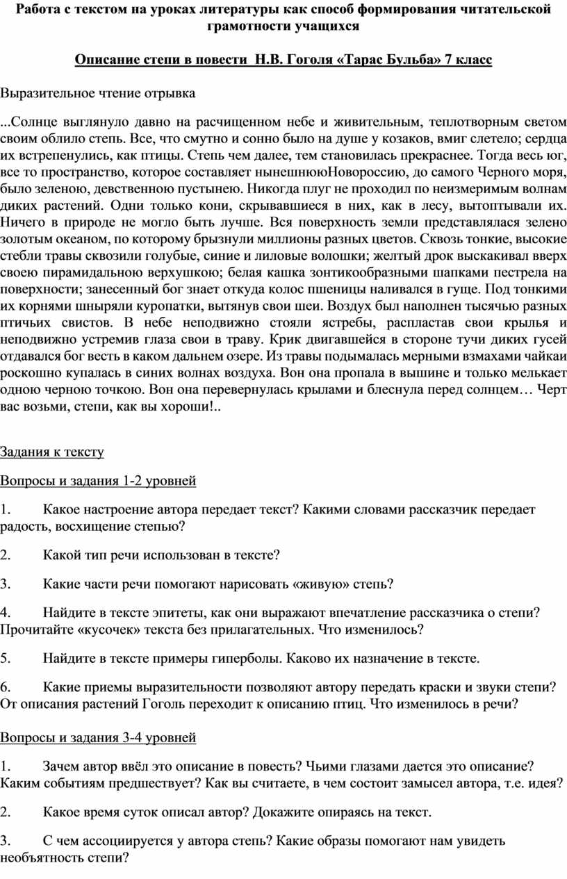 Описание степи в повести Н.В. Гоголя «Тарас Бульба» 7 класс