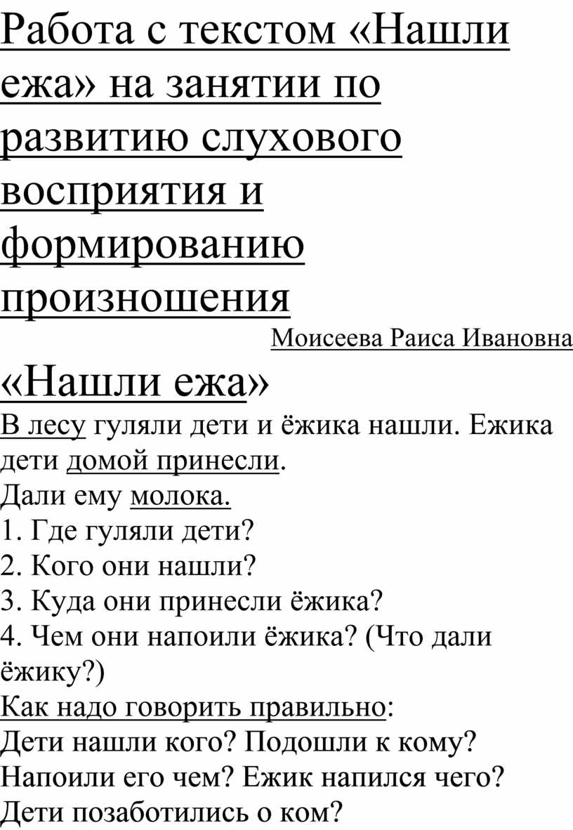 Работа с текстом «Нашли ежа» на занятии по развитию слухового восприятия и формированию произношения