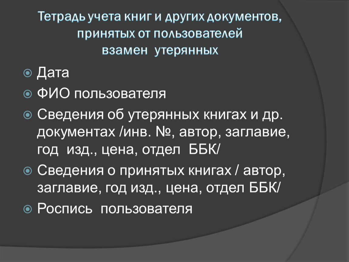 Тетрадь учета книг и других документов, принятых от пользователей взамен утерянных