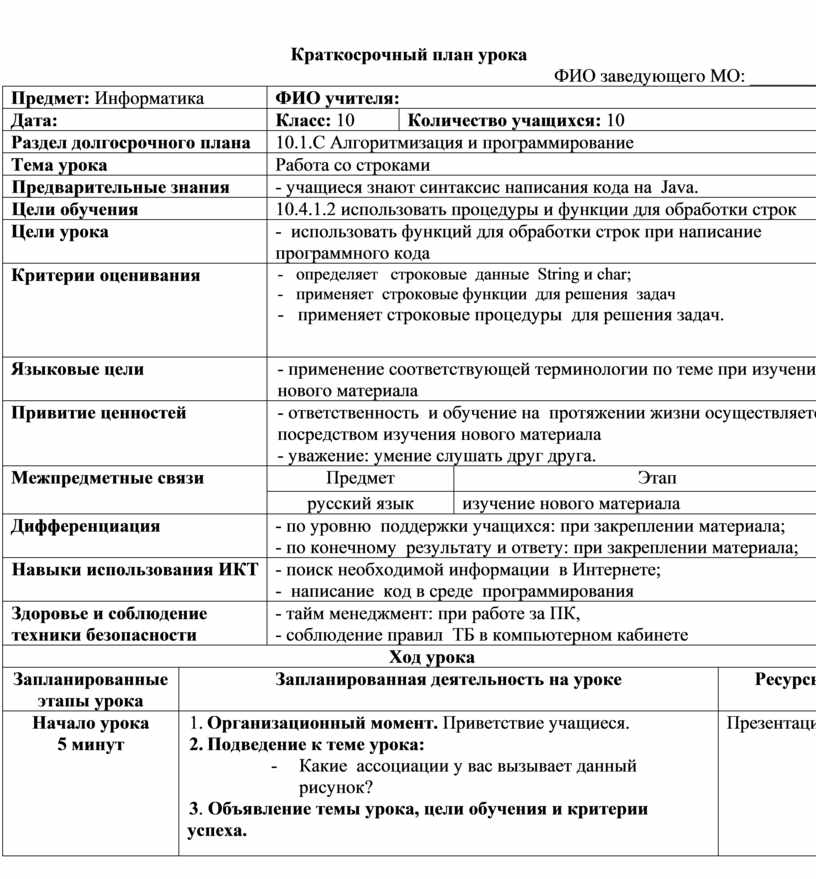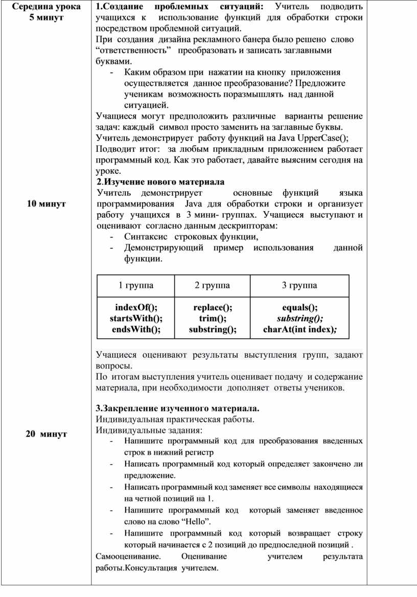 1.Создание проблемных ситуаций: Учитель подводить учащихся к использование функций для обработки строки посредством проблемной ситуаций. При создания дизайна рекламного банера было решено слово “ответственность” преобразовать и записать заглавными буквами. - Каким образом при нажатии на кнопку приложения осуществляется данное преобразование? Предложите ученикам возможность поразмышлять над данной ситуацией. Учащиеся могут предположить различные варианты решение задач: каждый символ просто заменить на заглавные буквы. Учитель демонстрирует работу функций на Java UpperCase(); Подводит итог: за любым прикладным приложением работает программный код. Как это работает, давайте выясним сегодня на уроке. 2.Изучение нового материала Учитель демонстрирует основные функций языка программирования Java для обработки строки и организует работу учащихся в 3 мини- группах. Учащиеся выступают и оценивают согласно данным дескрипторам: - Синтаксис строковых функции, - Демонстрирующий пример использования данной функции.