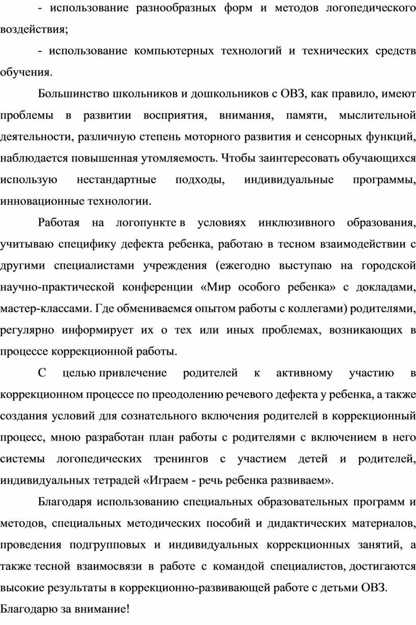 Работая на логопункте в условиях инклюзивного образования, учитываю специфику дефекта ребенка, работаю в тесном взаимодействии с другими специалистами учреждения (ежегодно выступаю на городской научно-практической конференции «Мир особого ребенка» с докладами, мастер-классами. Где обмениваемся опытом работы с коллегами) родителями, регулярно информирует их о тех или иных проблемах, возникающих в процессе коррекционной работы.