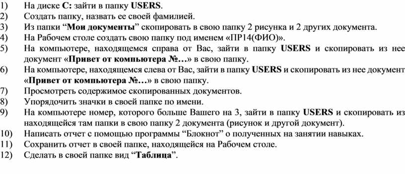 9) На компьютере номер, которого больше Вашего на 3, зайти в папку USERS и скопировать из находящейся там папки в свою папку 2 документа (рисунок и другой документ).