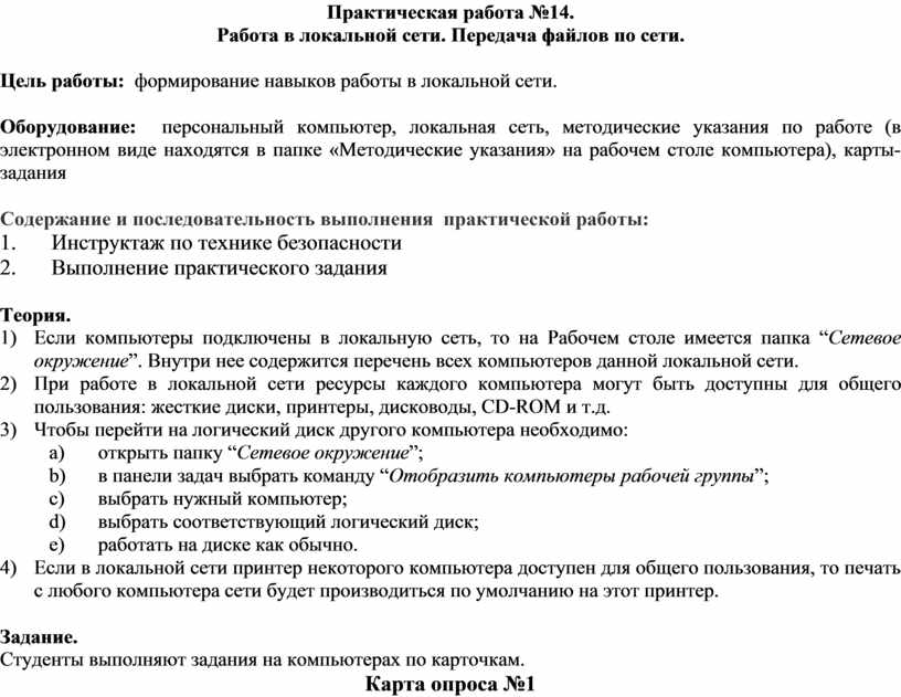 Оборудование: персональный компьютер, локальная сеть, методические указания по работе (в электронном виде находятся в папке «Методические указания» на рабочем столе компьютера), карты-задания