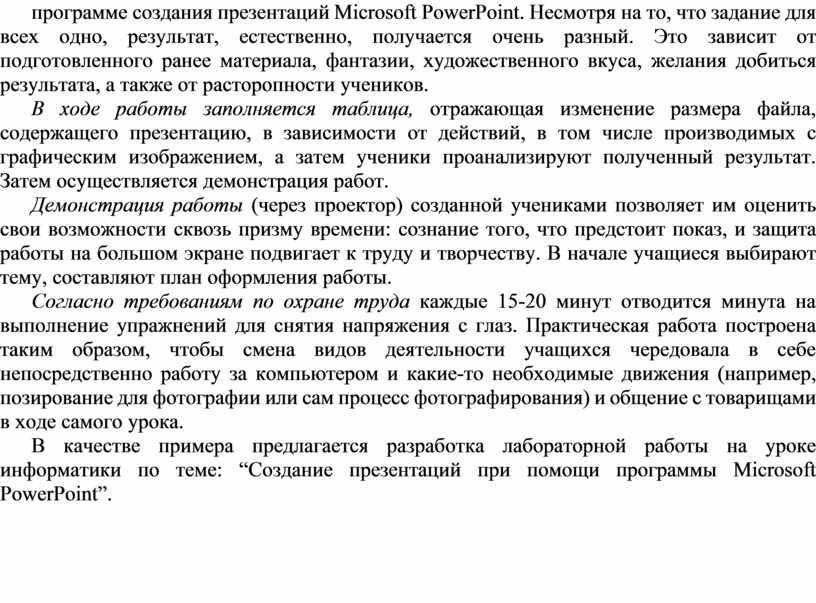 В качестве примера предлагается разработка лабораторной работы на уроке информатики по теме: “Создание презентаций при помощи программы Microsoft PowerPoint”.
