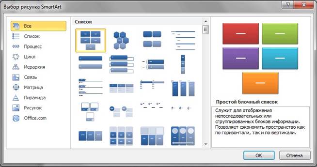 Слева размещается список типов графических объектов SmartArt. Каждый тип содержит несколько графических макетов, отображающихся в середине. Справа выводится вспомогательная информация по каждому конкретному макету.