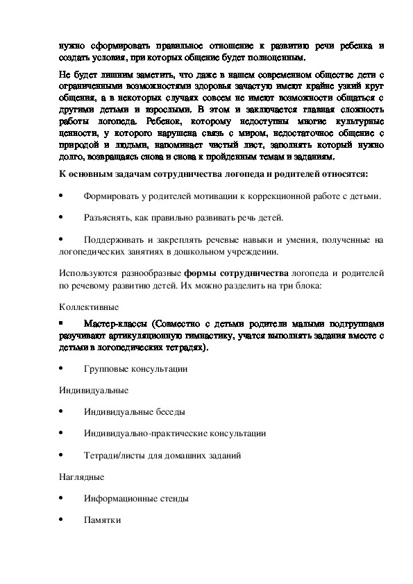 сотрудничество логопеда и родителей. В работе с родителями логопедунужно сформировать правильное отношение к развитию речи ребенка и