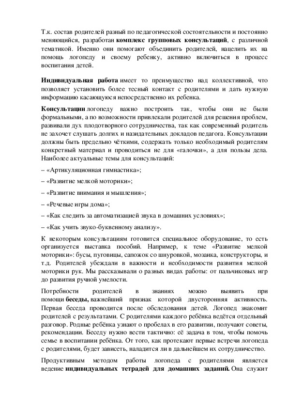 Работа с семьей,имеющей ребенка с нарушениями речи, на сегодняшний день, является одной из актуальных проблем логопедической работы. В современном мире родители недостаточно времени уделяют общению с детьми. Логопеды, используя различные формы сотрудничества с родителями, привлекают их к активному участию в коррекционный процесс, помогают осознать родителями роли семьи в обучении и воспитании ребенка с ОВЗ.