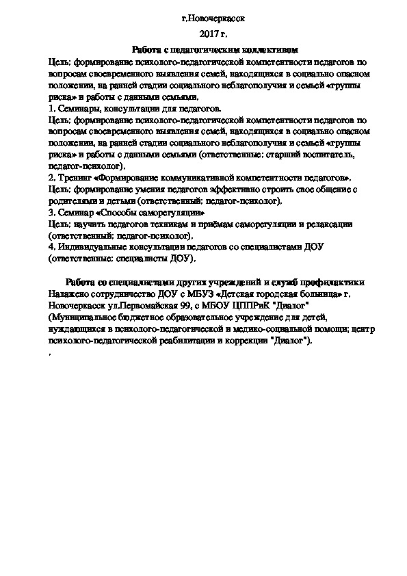Цель: формирование психолого-педагогической компетентности педагогов по вопросам своевременного выявления семей, находящихся в социально опасном положении, на ранней стадии социального неблагополучия и семьей «группы риска» и работы с данными семьями.формирование умения педагогов эффективно строить свое общение с родителями и детьми, упражнять педагогов техникам и приёмам саморегуляции и релаксации.word