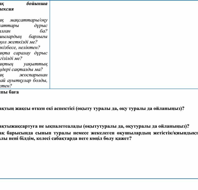 Сабақтың жақсы өткен екі аспектісі (оқыту туралы да, оқу туралы да ойланыңыз)? 1: 2: Сабақтыжақсартуға не ықпалетеалады (оқытутуралы да, оқутуралы да ойланыңыз)? Сабақ барысында сынып туралы немесе жекелеген оқушылардың жетістік/қиындықтары туралы нені білдім, келесі сабақтарда неге көңіл бөлу қажет?