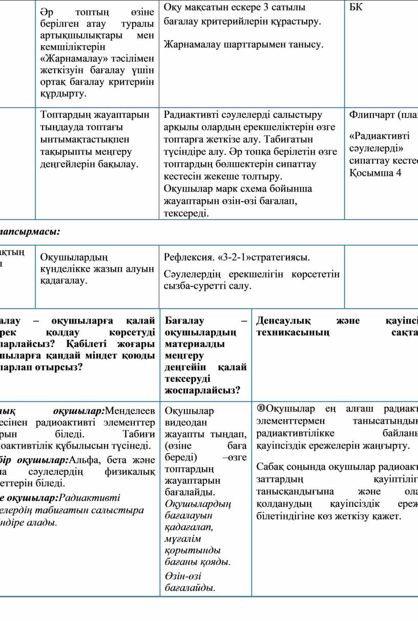 Радиактивті сәулелерді салыстыру арқылы олардың ерекшеліктерін өзге топтарға жеткізе алу. Табиғатын түсіндіре алу. Әр топқа берілетін өзге топтардың бөлшектерін сипаттау кестесін жекеше толтыру. Оқушылар марк схема бойынша жауаптарын өзін-өзі бағалап, тексереді. |