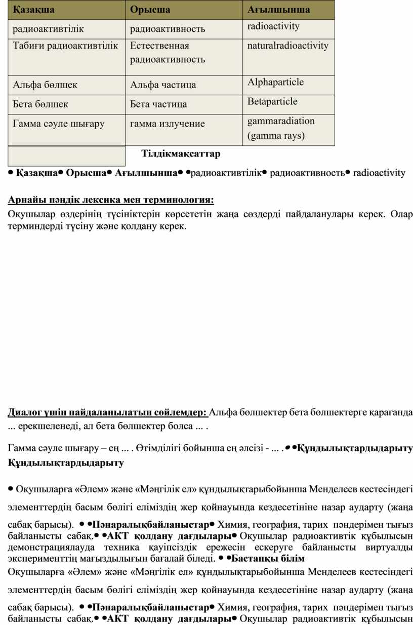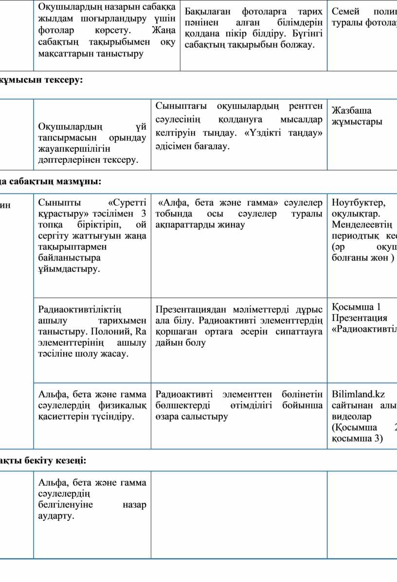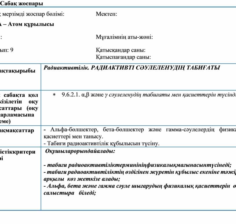 Барлық оқушылар:Менделеев кестесінен радиоактивті элементтер қатарын біледі. Табиғи радиоактивтілік құбылысын түсінеді. Кейбір оқушылар:Альфа, бета және гамма сәулелердің физикалық қасиеттерін біледі. Жеке оқушылар:Радиактивті сңулелердің табиғатын салыстыра түсіндіре алады. |