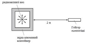 3. Радиоктивті көзден гейгер есептегіші арқылы сәулені анықтайды. Суретте көрсетілгендей радиоактивті көз қалың алюминй контейнердің ішінде орналасқан.