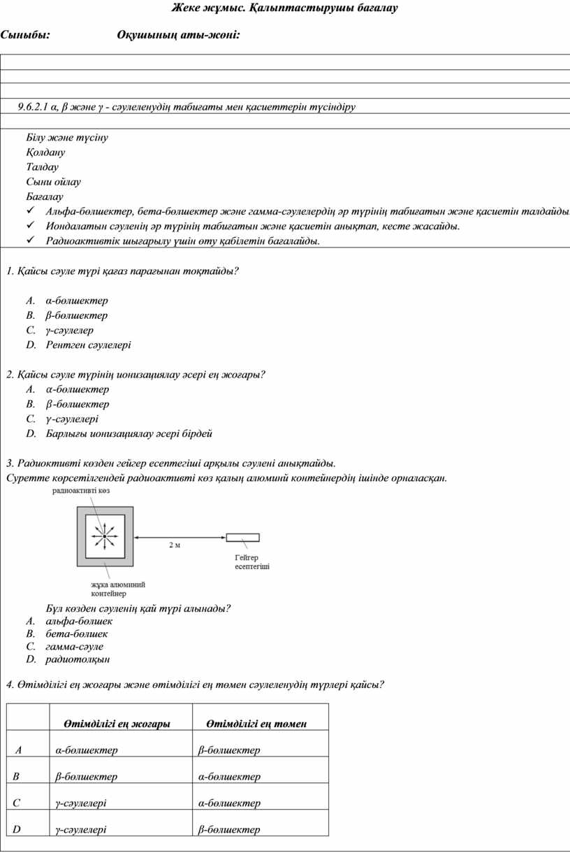 Білу және түсіну Қолдану Талдау Сыни ойлау Бағалау ü Альфа-бөлшектер, бета-бөлшектер және гамма-сәулелердің әр түрінің табиғатын және қасиетін талдайды. ü Иондалатын сәуленің әр түрінің табиғатын және қасиетін анықтап, кесте жасайды. ü Радиоактивтік шығарылу үшін өту қабілетін бағалайды. |