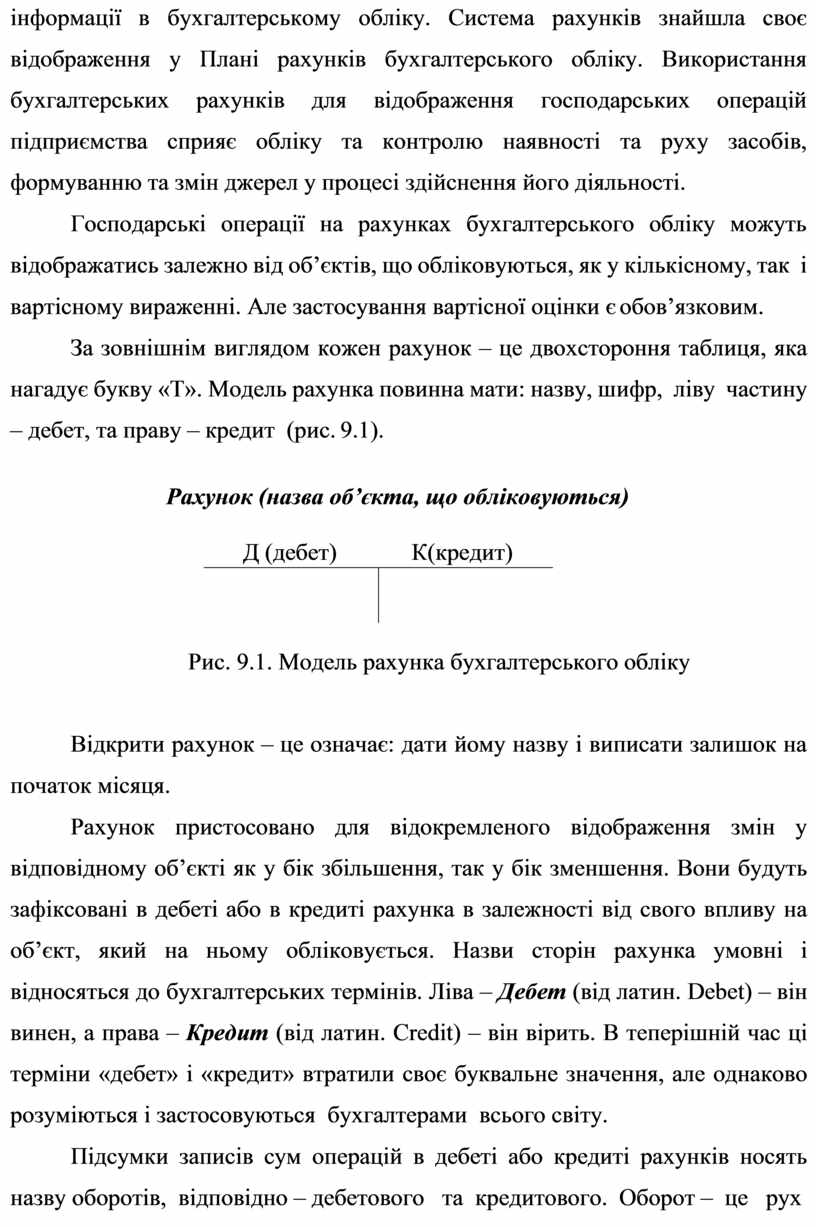 За зовнішнім виглядом кожен рахунок – це двохстороння таблиця, яка нагадує букву «Т». Модель рахунка повинна мати: назву, шифр, ліву частину – дебет, та праву – кредит (рис. 9.1).
