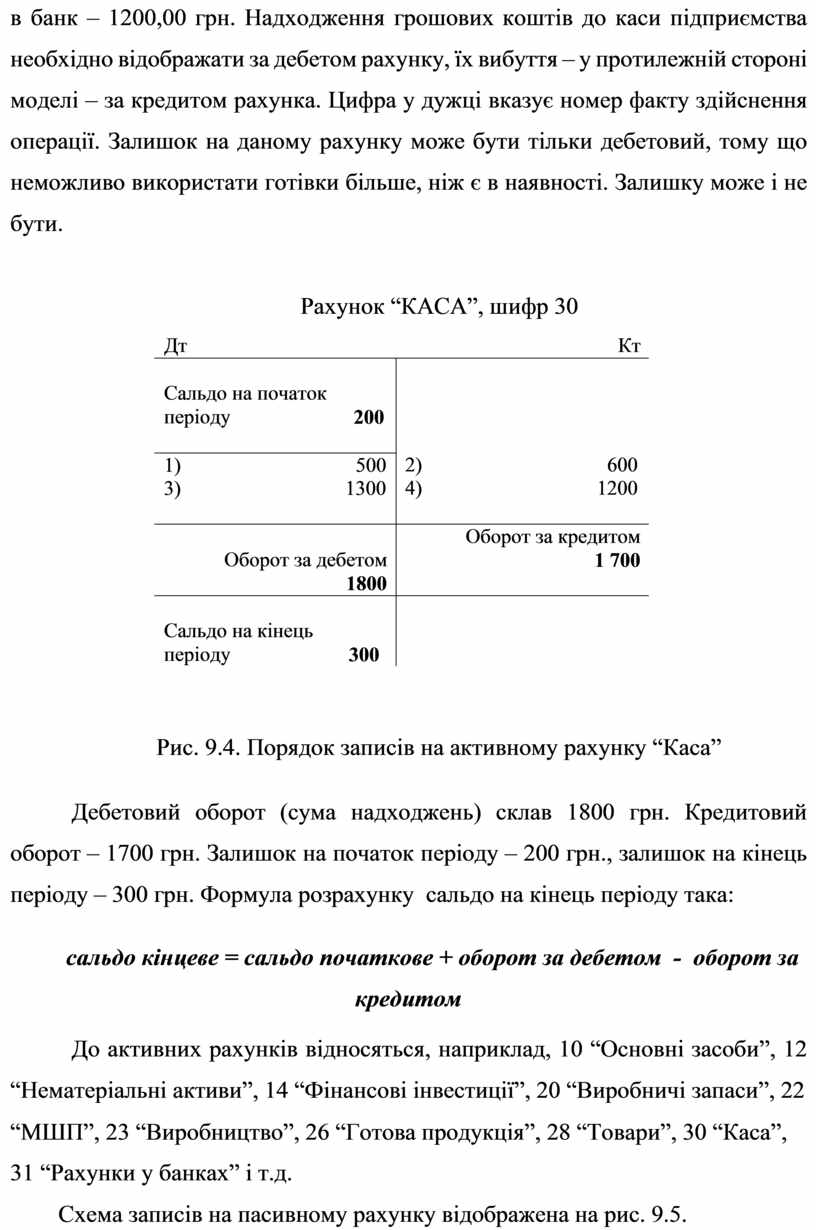 Для ілюстрації наведено порядок записів на активному рахунку “Каса” (рис. 9.4). Залишок на початок місяця в касі підприємства складав 200,00 грн. Протягом місяця до каси надійшли кошти з банку – 500,00 грн. та від покупців – 1300,00 грн.; видано грошові кошти у підзвіт – 600,0 грн. та здано