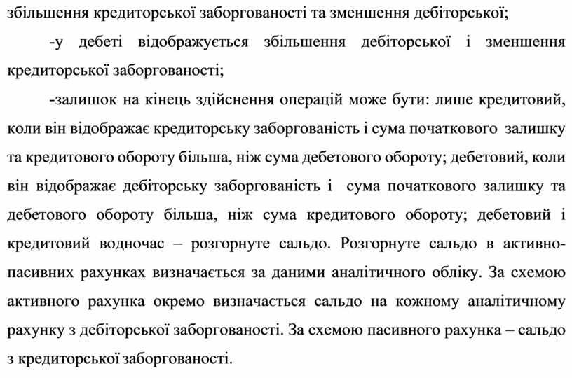 -залишок на кінець здійснення операцій може бути: лише кредитовий, коли він відображає кредиторську заборгованість і сума початкового залишку та кредитового обороту більша, ніж сума дебетового обороту; дебетовий, коли він відображає дебіторську заборгованість і сума початкового залишку та дебетового обороту більша, ніж сума кредитового обороту; дебетовий і кредитовий водночас – розгорнуте сальдо. Розгорнуте сальдо в активно-пасивних рахунках визначається за даними аналітичного обліку. За схемою активного рахунка окремо визначається сальдо на кожному аналітичному рахунку з дебіторської заборгованості. За схемою пасивного рахунка – сальдо з кредиторської заборгованості.
