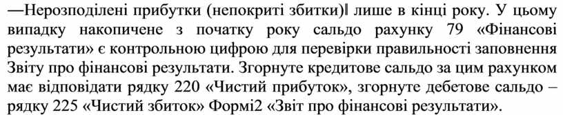 ―Нерозподілені прибутки (непокриті збитки)‖ лише в кінці року. У цьому випадку накопичене з початку року сальдо рахунку 79 «Фінансові результати» є контрольною цифрою для перевірки правильності заповнення Звіту про фінансові результати. Згорнуте кредитове сальдо за цим рахунком має відповідати рядку 220 «Чистий прибуток», згорнуте дебетове сальдо – рядку 225 «Чистий збиток» Формі2 «Звіт про фінансові результати».