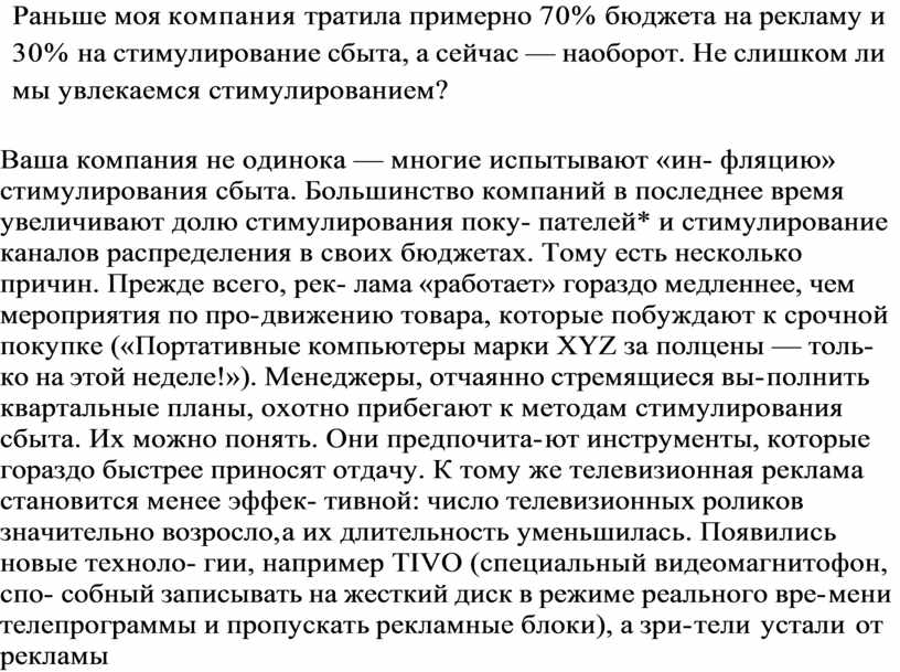 Ваша компания не одинока — многие испытывают «ин фляцию» стимулирования сбыта. Большинство компаний в последнее время увеличивают долю стимулирования поку пателей* и стимулирование каналов распределения в своих бюджетах. Тому есть несколько причин. Прежде всего, рек лама «работает» гораздо медленнее, чем мероприятия по про движению товара, которые побуждают к срочной покупке («Портативные компьютеры марки XYZ за полцены — толь ко на этой неделе!»). Менеджеры, отчаянно стремящиеся вы полнить квартальные планы, охотно прибегают к методам стимулирования сбыта. Их можно понять. Они предпочита ют инструменты, которые гораздо быстрее приносят отдачу. К тому же телевизионная реклама становится менее эффек тивной: число телевизионных роликов значительно возросло, а их длительность уменьшилась. Появились новые техноло гии, например TIVO (специальный видеомагнитофон, спо собный записывать на жесткий диск в режиме реального вре мени телепрограммы и пропускать рекламные блоки), а зри тели устали от рекламы