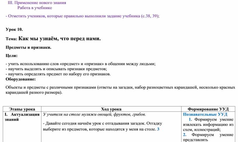 1. Потренируемся определять предметы по их признакам. Поиграем в игру «Угадай предмет» Учитель вызывает одного ученика и говорит ему на ухо название предмета. Ученик с помощью признаков описывает предмет вслух. Отгадавший становится водящим. - Что мы сейчас делали? - Чему учила нас игра? 1 2. Работа в тетради. 6 Выполнение задания №1,с.13 - В наших тетрадях тоже похожие загадки, нарисуйте ответ. Дети самостоятельно выполняют задание. 3. Работа в учебнике. 3 - Откройте учебники на с.40. Рассмотрите первую картинку. - Что общего у всех предметов? - Какой из предметов лишний? Почему? Выполняется аналогичная работа с картинками второй и третьей. Третью картинку можно дать для работы в паре. 4. - Существуют и другие признаки, по которым можно выявить свойства предметов. Откройте учебники на с. 42. - Назовите слова, с помощью которых мы отличаем один предмет от другого? - Найдите предметы с такими же признаками у себя на парте. - В кабинете. - Как мы сейчас различали предметы? (По их признакам.) - Какой мы вывод можем сделать? Предмет можно узнать по его свойствам. 4. - Отгадайте загадку: Белый камень в воде тает. - Какие слова помогли вам отгадать загадку. - Какие свойства предмета они называли? 5. Попробуем найти недостающий предмет. Работа в тетради. 3 Выполнение задания №3, с.14 6.- Ребята, помогите мне закончить предложения: За окном летит … (птица, бабочка и т.д.) По дорожке ползёт … В реке плавает …. 7. Работа в учебнике. - Посмотрите в учебнике на рисунки внизу страницы. Подберите нужное слово к каждому рисунку. - Какой признак предмета мы называли? - Для чего? Когда нам это нужно в жизни? 8. - Отгадайте загадку в учебнике на с. 43. - Что это? - Что вам помогло узнать предмет? - Как ещё можно узнать предмет? Предмет можно узнать по его действиям.
