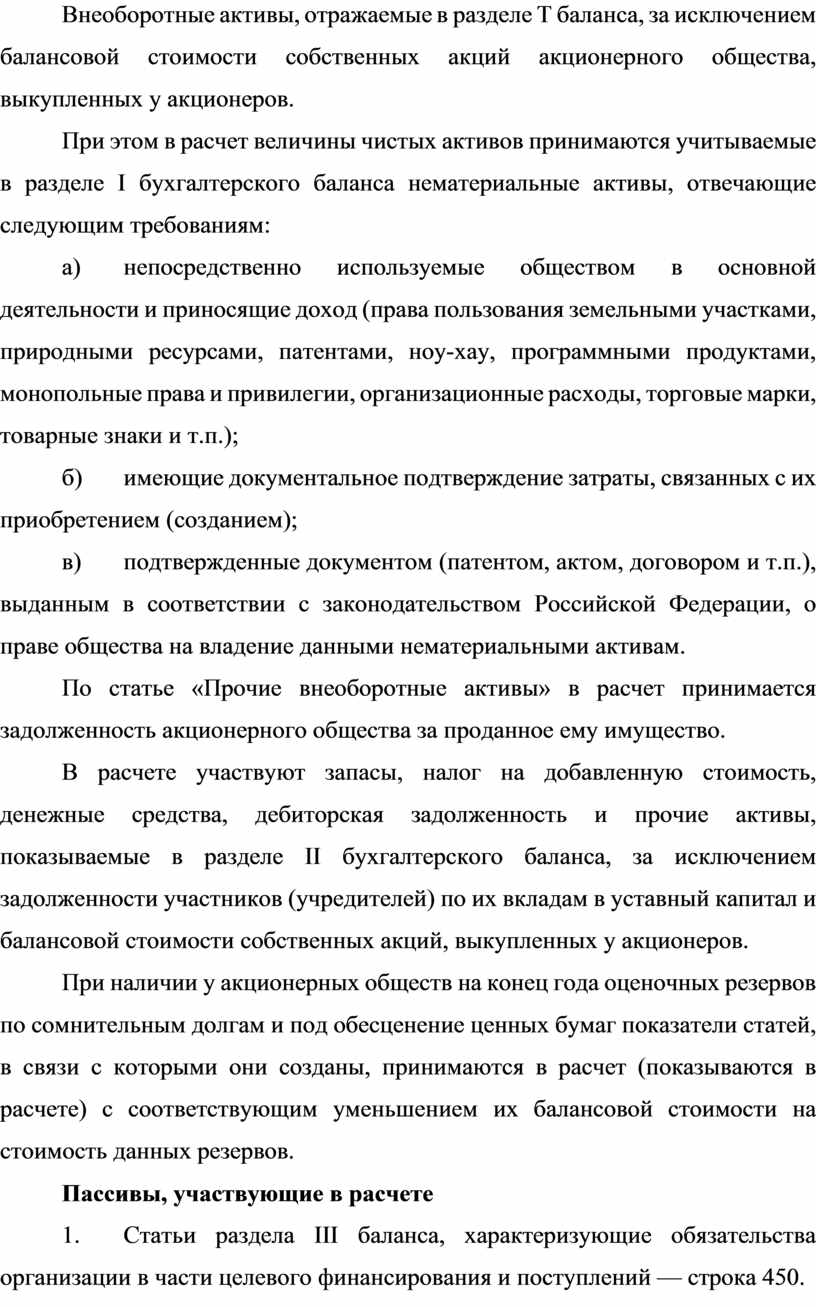 Внеоборотные активы, отражаемые в разделе Т баланса, за исключением балансовой стоимости собственных акций акционерного общества, выкупленных у акционеров.