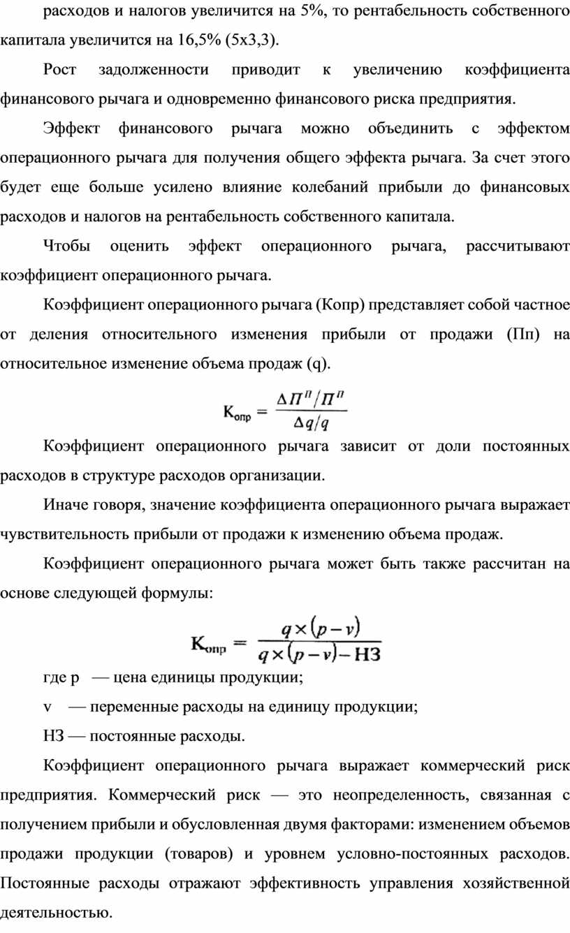 Коэффициент операционного рычага выражает коммерческий риск предприятия. Коммерческий риск — это неопределенность, связанная с получением прибыли и обусловленная двумя факторами: изменением объемов продажи продукции (товаров) и уровнем условно-постоянных расходов. Постоянные расходы отражают эффективность управления хозяйственной деятельностью.
