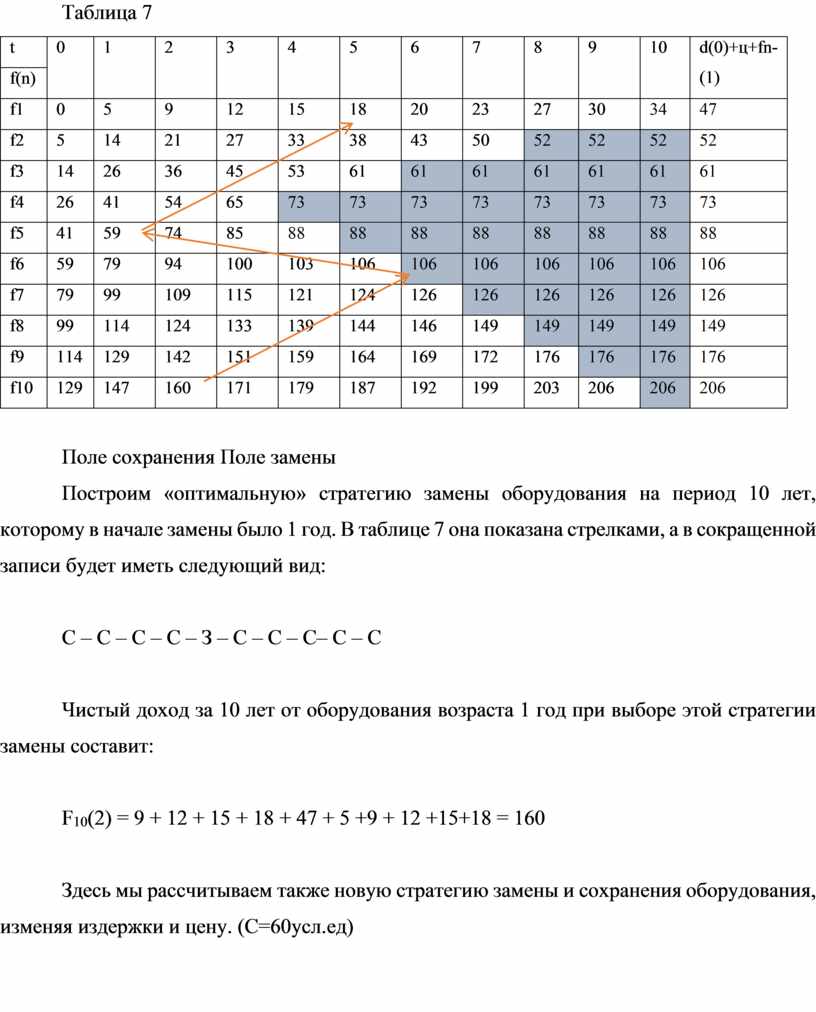 Построим «оптимальную» стратегию замены оборудования на период 10 лет, которому в начале замены было 1 год. В таблице 7 она показана стрелками, а в сокращенной записи будет иметь следующий вид:
