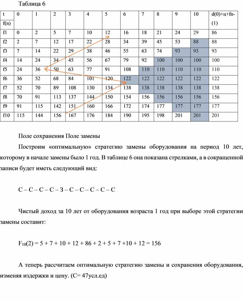 Построим «оптимальную» стратегию замены оборудования на период 10 лет, которому в начале замены было 1 год. В таблице 6 она показана стрелками, а в сокращенной записи будет иметь следующий вид: