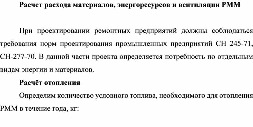 Расчет расхода материалов, энергоресурсов и вентиляции РММ