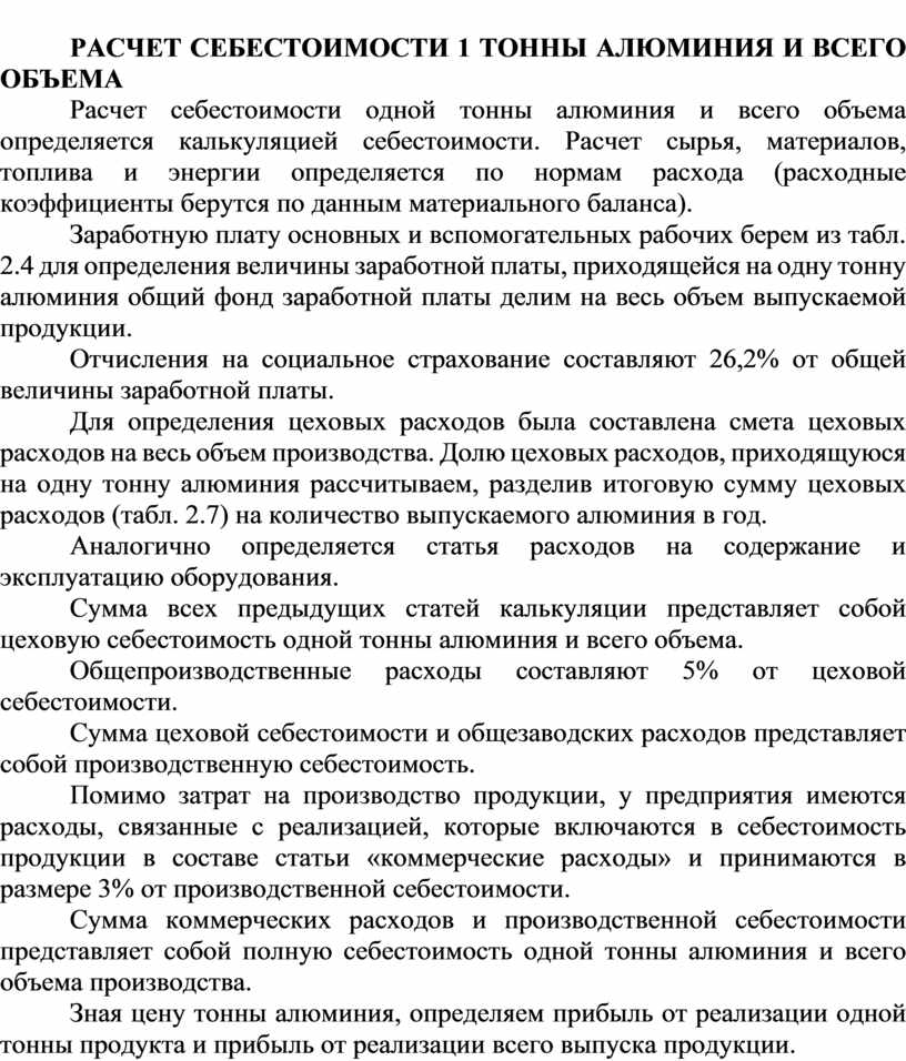 Сумма всех предыдущих статей калькуляции представляет собой цеховую себестоимость одной тонны алюминия и всего объема.