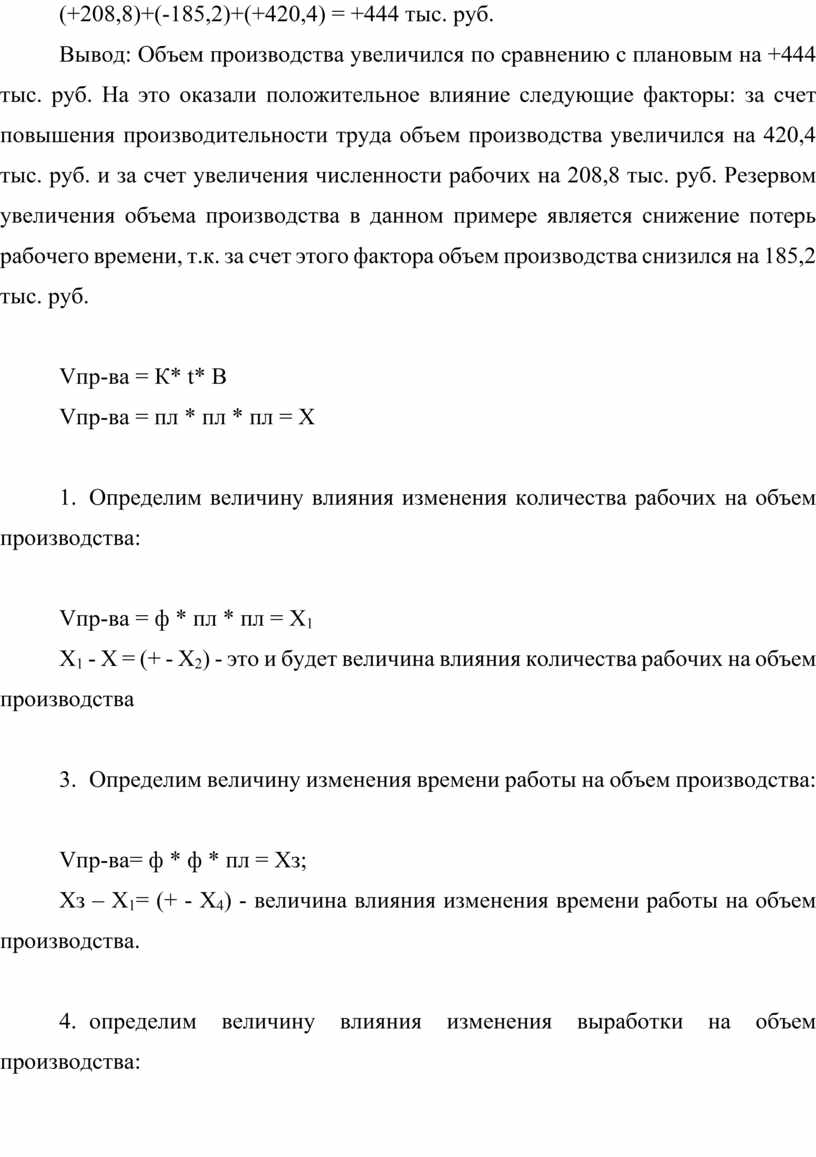 Вывод: Объем производства увеличился по сравнению с плановым на +444 тыс. руб. На это оказали положительное влияние следующие факторы: за счет повышения производительности труда объем производства увеличился на 420,4 тыс. руб. и за счет увеличения численности рабочих на 208,8 тыс. руб. Резервом увеличения объема производства в данном примере является снижение потерь рабочего времени, т.к. за счет этого фактора объем производства снизился на 185,2 тыс. руб.